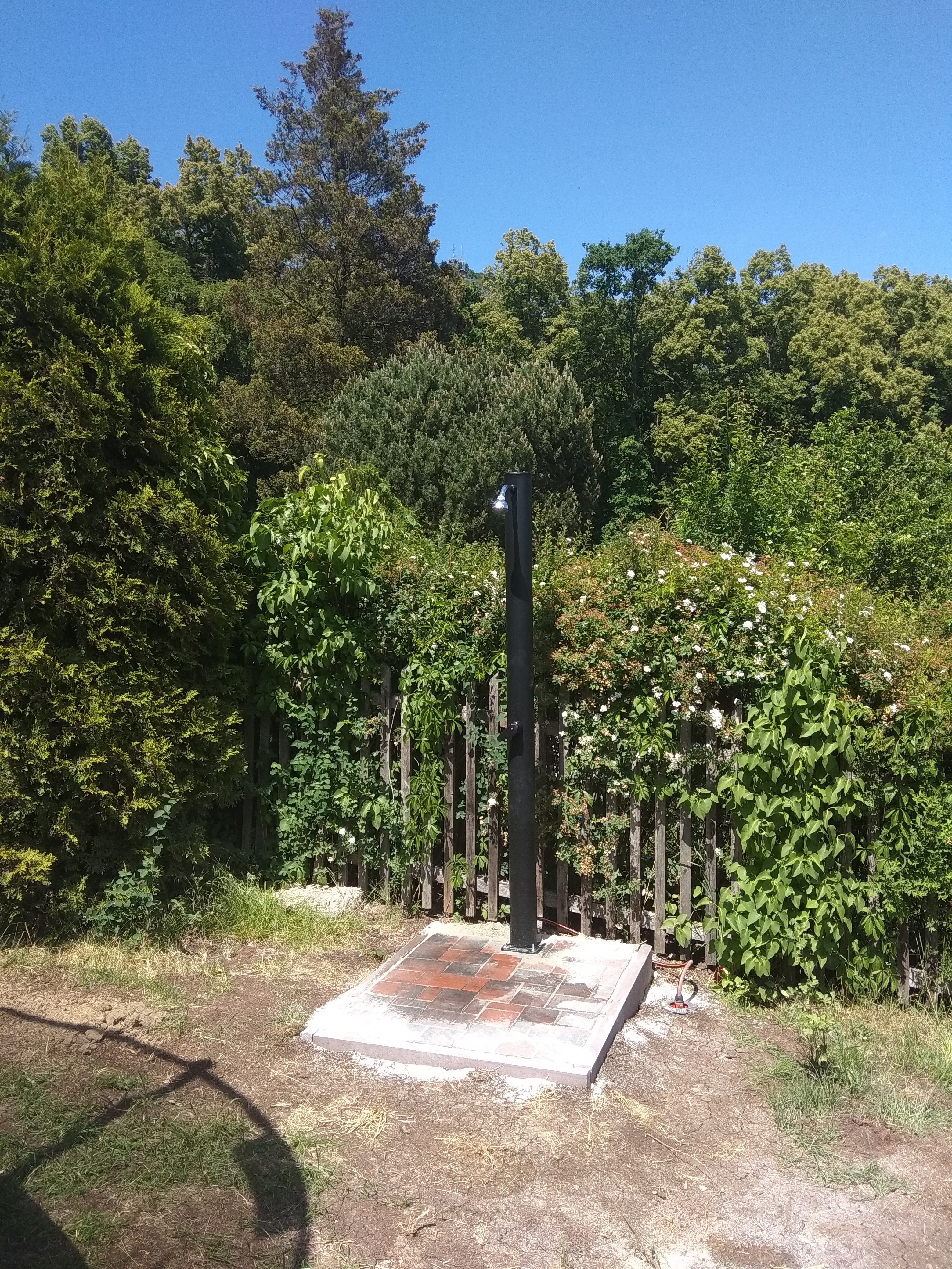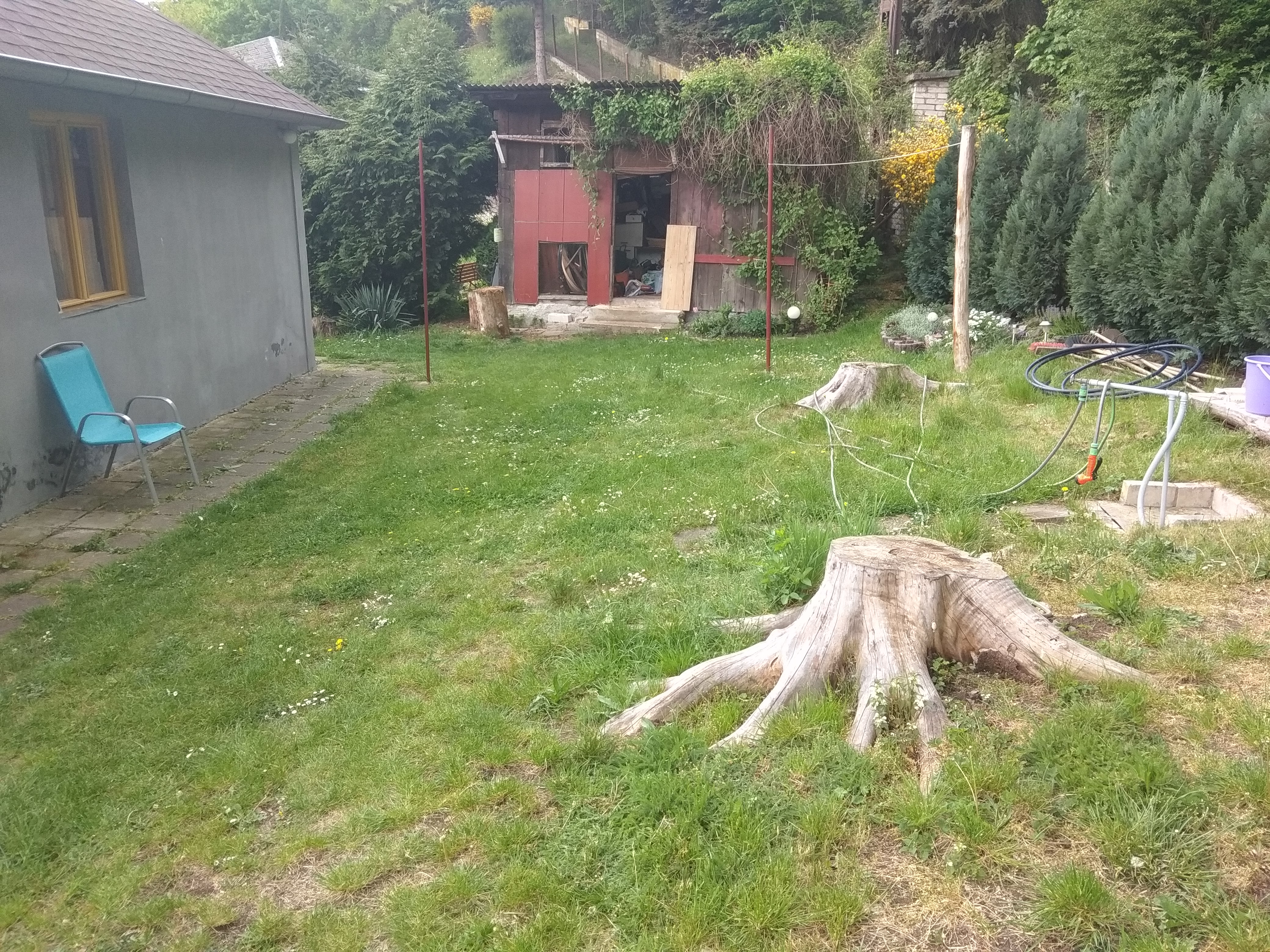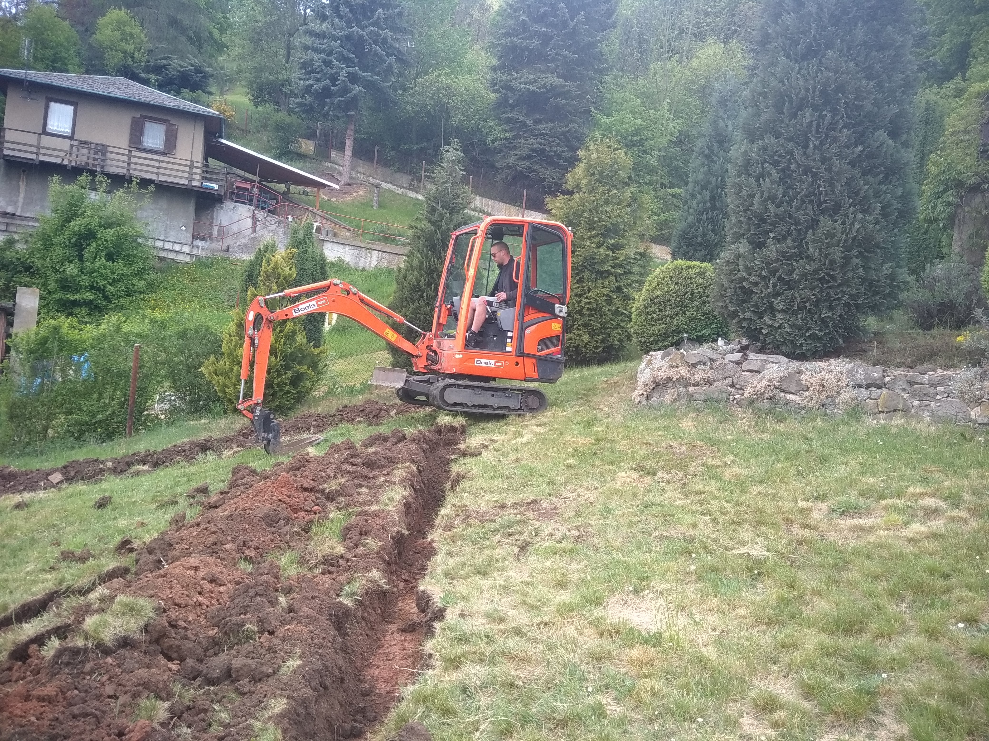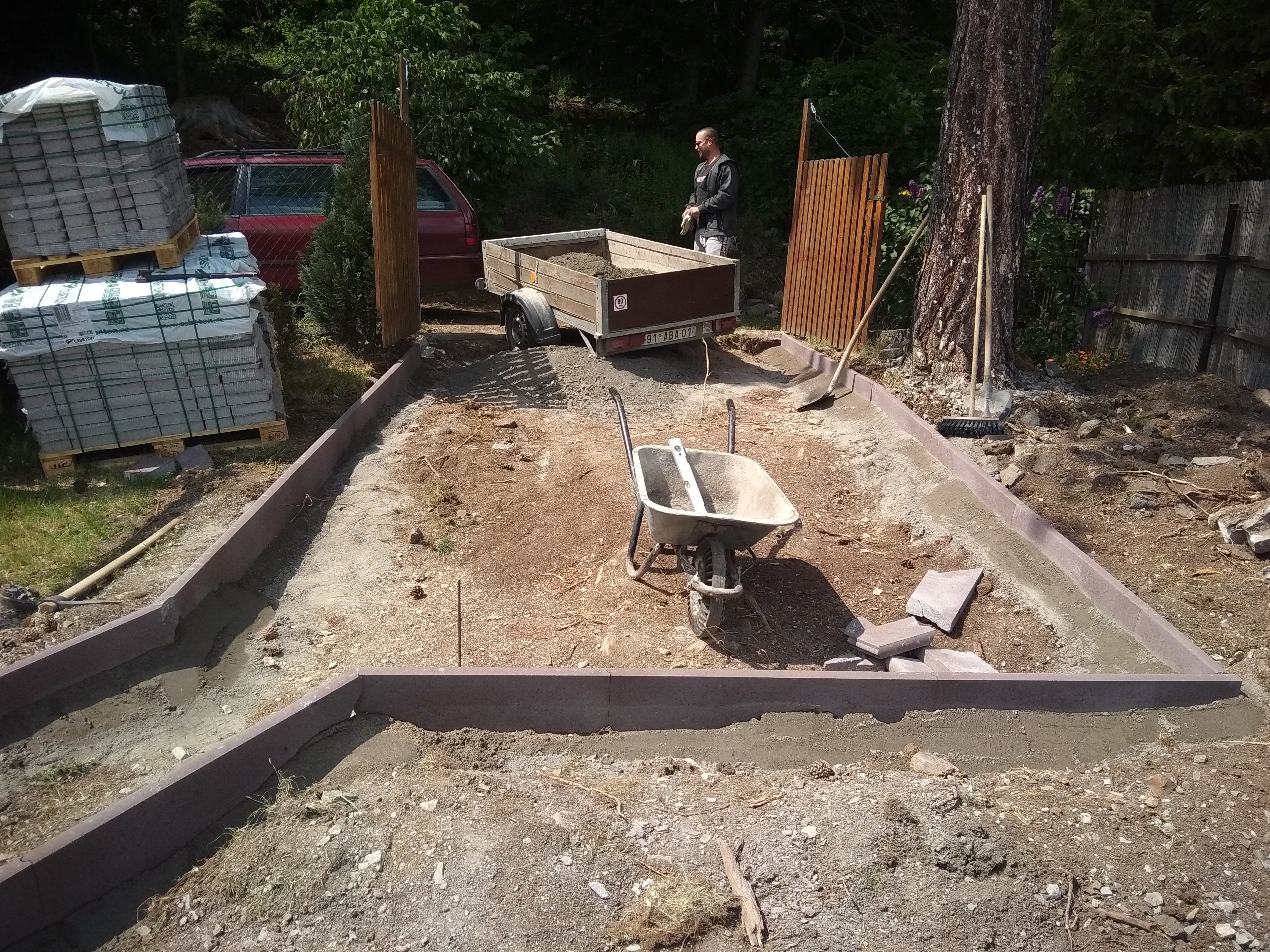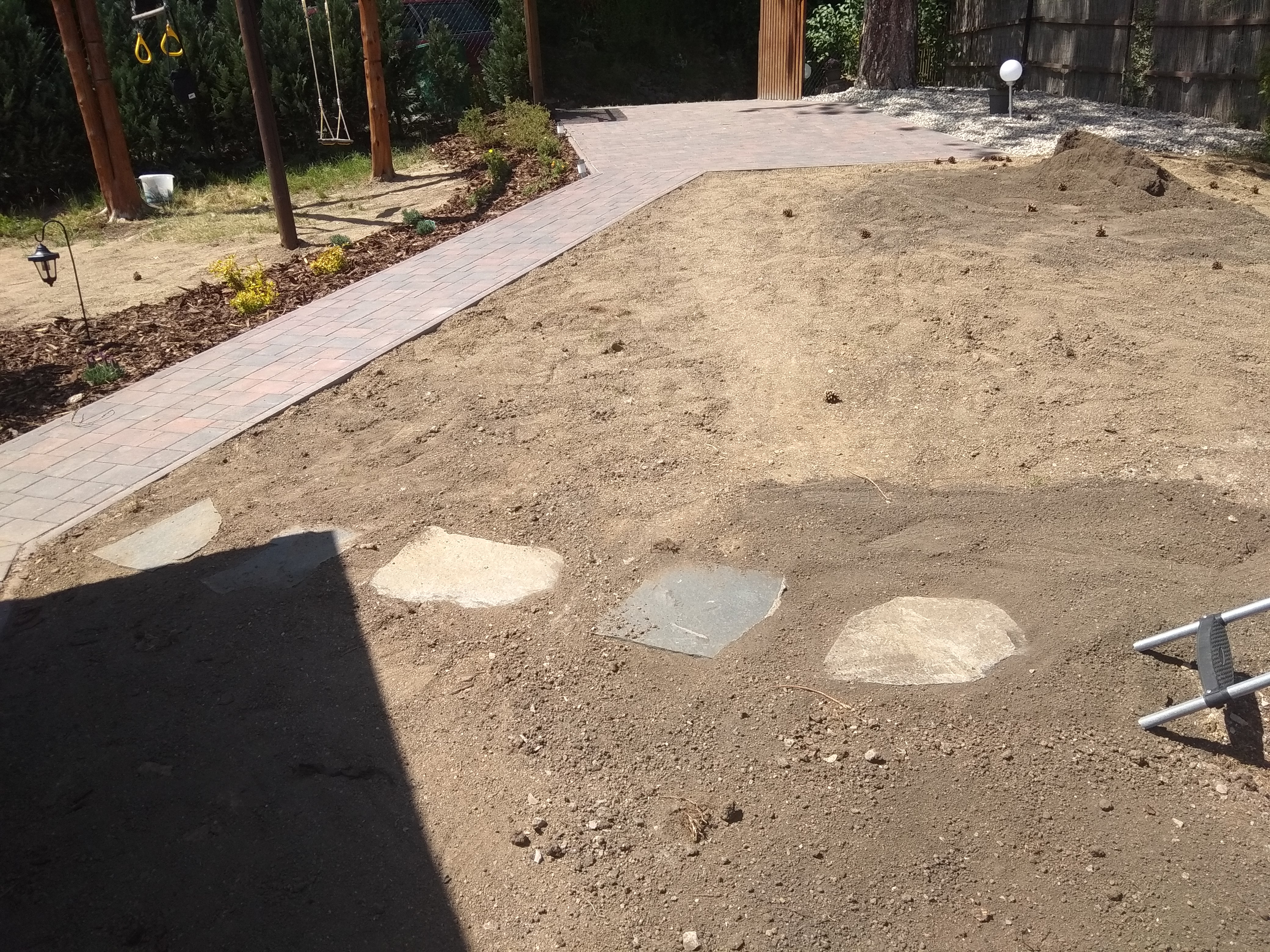Byla to krásná malá zakázka na které se u chaty vytvářely nové cesty, stání pro auto. Rozvedla se užitková voda po celé zahradě, jejíž vývody byly ukončeny vodní zásuvkou od fa. Gardena. Následovala betonáž obrubníků pokládka dlažby. Po hrubých stavebních pracích jsme se pustili do modelace terénu a formování výsadeb.