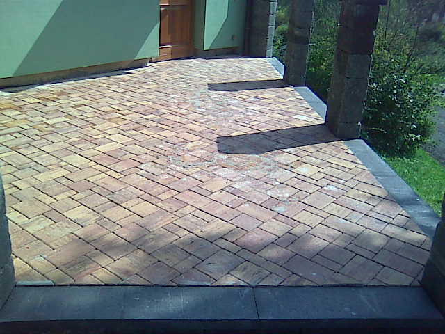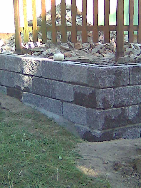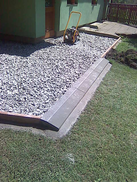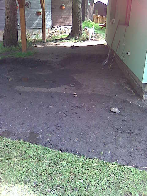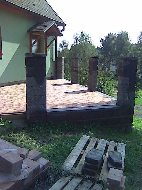Dlažba s terasou měla vzniknout u nového rodinného domu v obci Lhotka. Nejdříve se vystavěla opěrná zídka u terasy z KB-Bloku. Museli jsme vykopat základový pas, který se celý vylil betonem. Pak se vystavěla zeď z KB-Bloku, kterou jsme vyarmovali železem a zalili betonem.