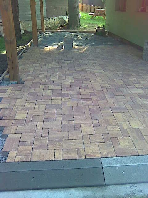 Potom jsme se vrhli na betonování obrubníků, mezitím kluci začali navážet štěrky do vzniklého prostoru. Po vytvrdnutí betonu se začali hutnit navozené štěrky, na které se mohla začít pokládat zámková dlažba. Byl zvolen typ CS BETON Histor colormix. Tato dlažba je velmi pěkná, zejména proto, že se skládá ze tří různě velikých kamenů a po položení má vzhled mozaiky. Celou zakázku jsme realizovali 14 dní.