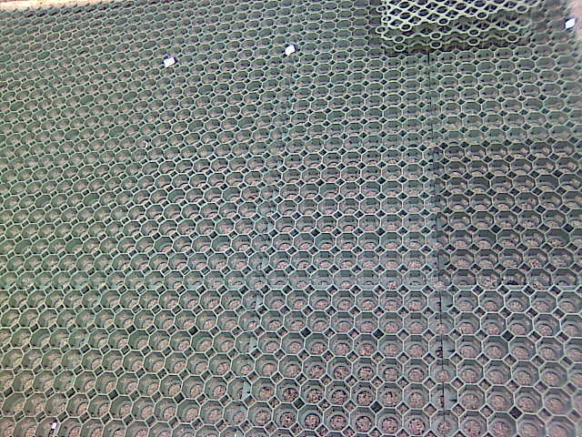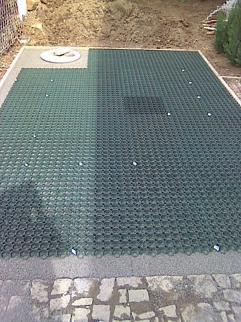 Srovnali jsme si celou plochu, kterou jsme uhutnili žehličkou. Do takto připravené plochy jsme začali skládat plastové zatravňovací prvky. Po dokončeni jsme celou plochu zasypali zeminou obohacenou na humus. Následně jsme do celé plochy zapravili travní semeno.