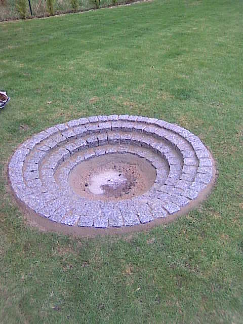 Pak nás ještě majitel požádal, jestli by jsme mu nepostavili ohniště. Měl na zahradě uskladněné žulové kostky, tak nebyl problém se do toho pustit. Jen jsme vybrali vhodné místo, vykopali potřebnou zeminu a do betonového lože, naklepali kostky do požadovaného tvaru. Celou realizaci jsme měli hotovou za necelé čtyři dny.
