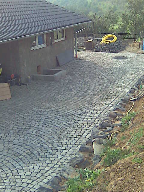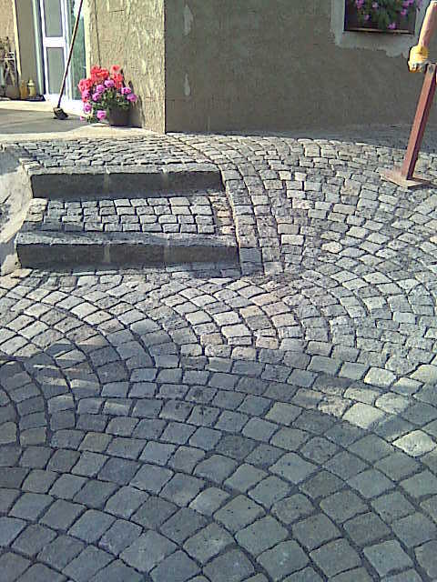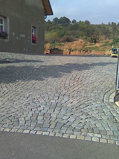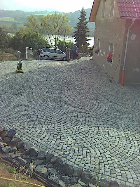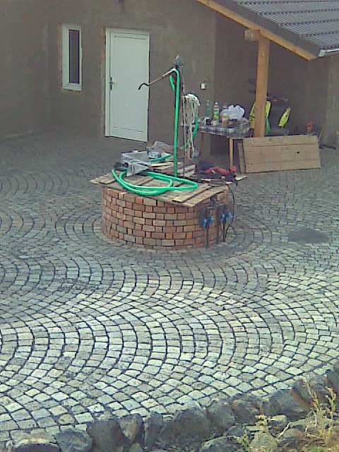 Když jsme měli studnu postavenou, zabetonovali jsme obrubníky, aby se mohl začít navážet a vrstvit štěrk, který jsme zhutnili 250kg žehličkou. Začali jsme příjezdovou cestou a na konec jsme naklepali žulovou dlažbu u nádvoří domu. Po položení celé plochy, jsme do spár vmetli prach a celou plochu znovu uhutnili žehličkou. Dílo jsme předávali za necelý měsíc a všichni jsme byli s výsledným efektem spokojeni.