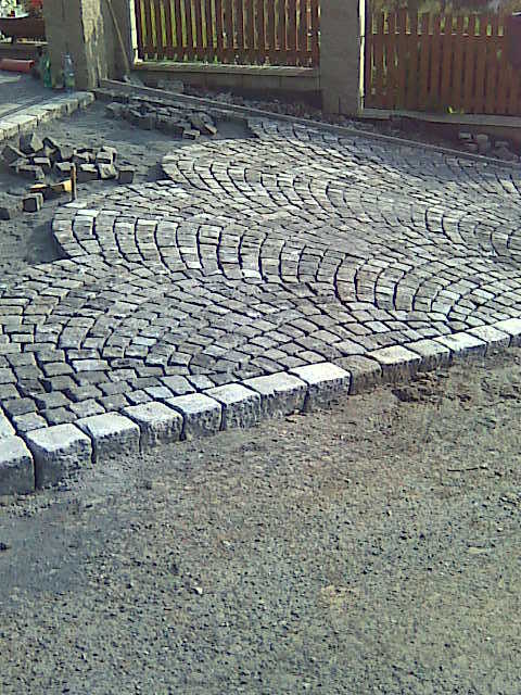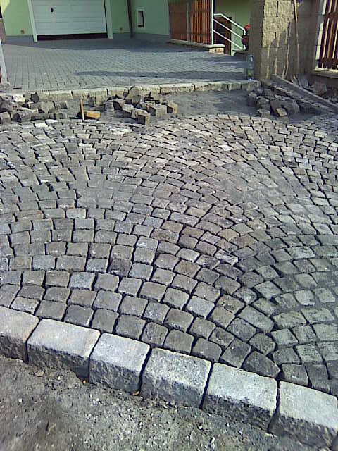 Nejprve jsme museli odtěžit stávající dlažbu a založit linky ze žulové dlažby, které se dávaly do betonu. Dovezl se štěrk, který se uhutnil a začala pokládka žulové dlažby. Byly to velké silniční kostky 10/10cm, tak nám práce šla od ruky. Za dva dny jsme měli hotovo, už stačilo jen vmést do dlažby prach a uhutnit žehličkou. Byla to rychlovka, kterou jsme zvládli za čtyři dny.