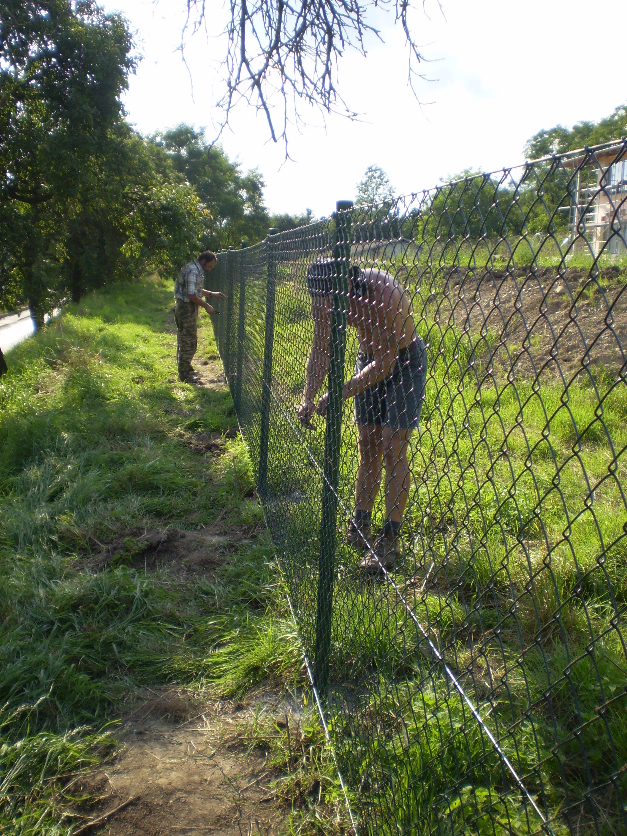 Dále jsme pokračovali montáží pětimetrových sloupů k dětskému hřišti. To bylo malinko komplikovanější, protože se betonovaly pětimetrové sloupy, ale do míst, kde se stavělo, se velký vrták nedostal, tak se vše muselo kopat ručně. Nakonec se to podařilo bez jakéhokoli zdržení. Na sloupy byly nataženy sítě z PVC v celé výšce sloupů. Sítě jsou zde, aby zabránily nechtěně zakopnutým míčům a jejich následnému dopadu na silnici.