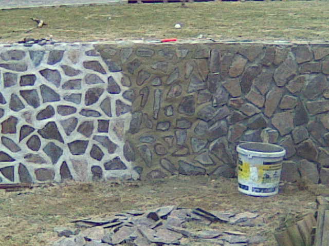 Nejprve jsme vykopali a vybetonovali základy zdi. Do základu se napíchali ocelové trny, na které se pak skládaly betonové dílce. Když byla zeď postavena, zalila se betonem. Další den jsme na zeď začali lepit přírodní kámen. Když byla celá zeď obložená začalo náročné spárování, které zabralo nejvíce času. Nakonec bylo dílo dokončeno v termínu a ke spokojenosti zákaznice.