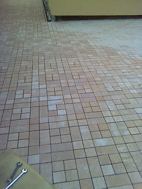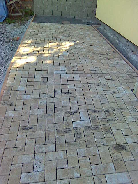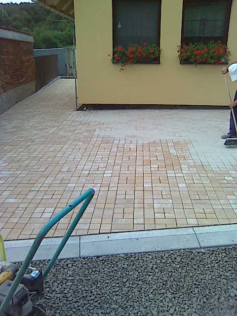 Nejprve se začalo s odbagrováním zeminy, které se z části muselo provádět ručně. Když bylo vše připravené, zabetonovali se zahradní obrubníky okolo domu. U příjezdové cesty pak byly použity silniční obrubníky. Do celé plochy se navozily štěrky které se po vrstvách uhutnily. Pak už následovala pokládka zámkové dlažby, dořezání, zasypání a konečné uhutnění celé plochy. Za čtrnáct dní bylo hotovo.