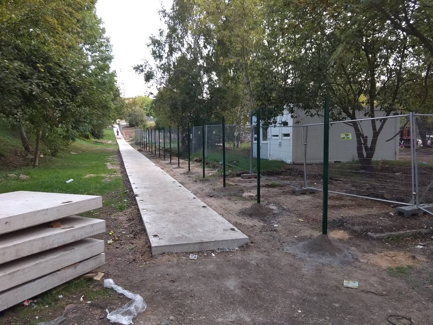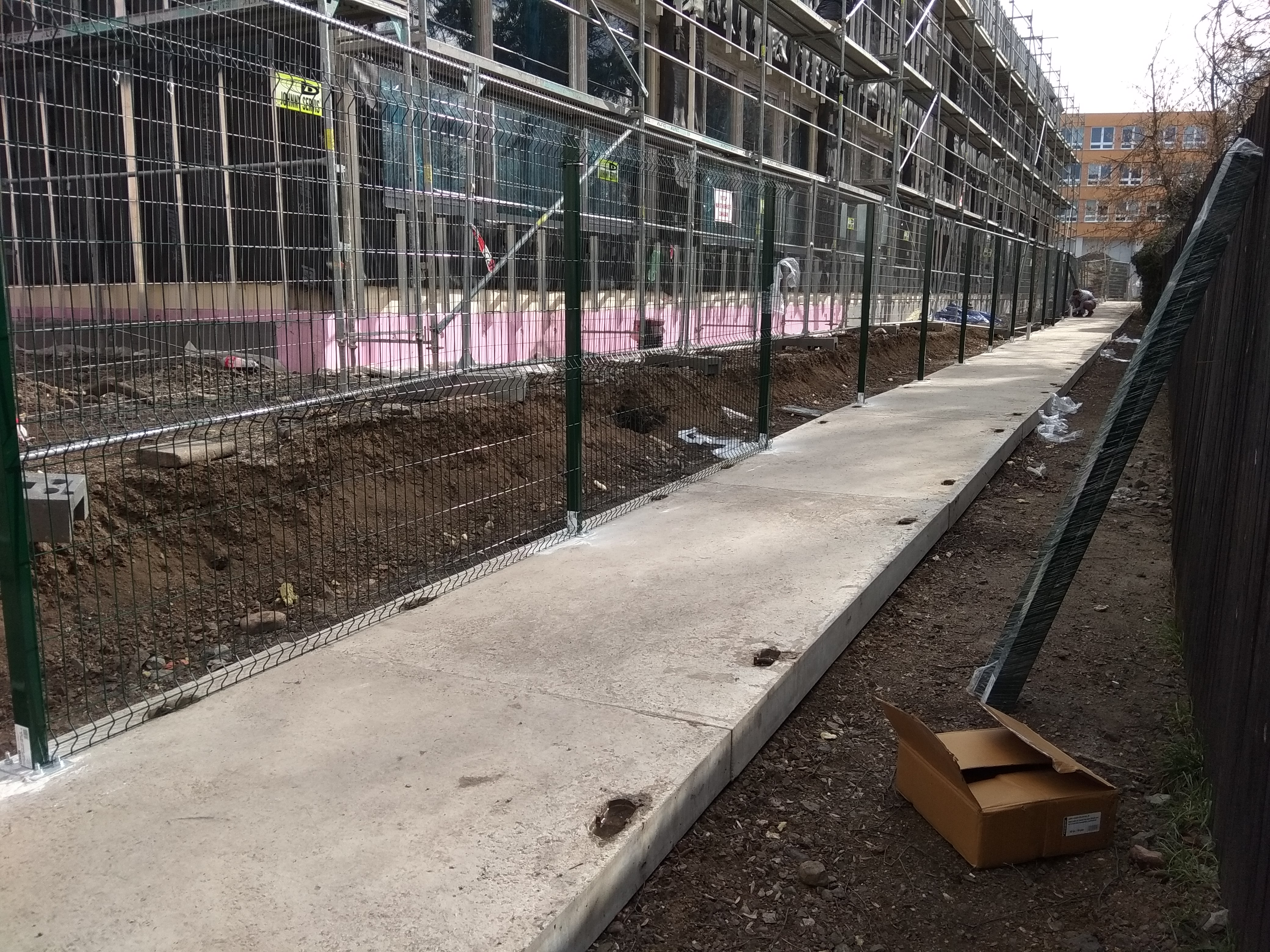 Začali jsme výstavbou oplocení s podhrabovou deskou. Vyvrtaly se a zabetonovaly sloupky. Po vyzrání betonu se mezi sloupky uložily podhrabové desky a osadily svařované sítě. Na druhé straně bylo oplocení bez podhrabových desek a sloupky byly přidělané na betonových panelech.