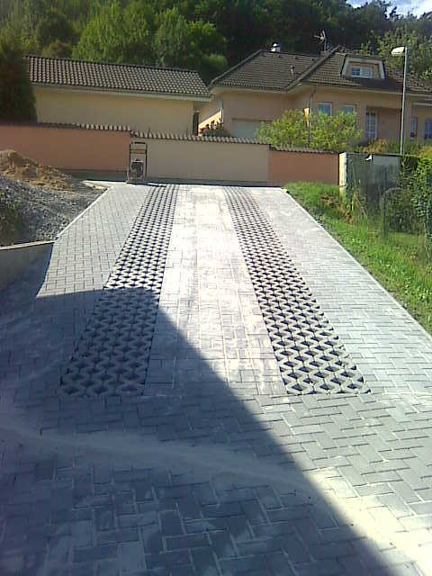 Nejdříve jsme si vytyčili veškeré plochy a začali s odtěžováním připravené plochy. Začali jsme s betonáží obrubníků, schodiště, základu a stavbě opěrné zídky. Když nám beton vytvrdl, navozili jsme do celé plochy štěrky, které jsme hutnily po vrstvách vibrační deskou. A mohli jsme začít s pokládkou zámkové dlažby. Do příjezdové cesty se kromě zámkové dlažby, kladly zatravňovací tvárnice, aby rozbily plochu betonové dlažby. Po dokončení příjezdové cesty, se položila dlažba na chodníky a schodiště. Nakonec se celá plocha zasypala pískem a zhutnila deskou. Za tři týdny bylo vše hotové.